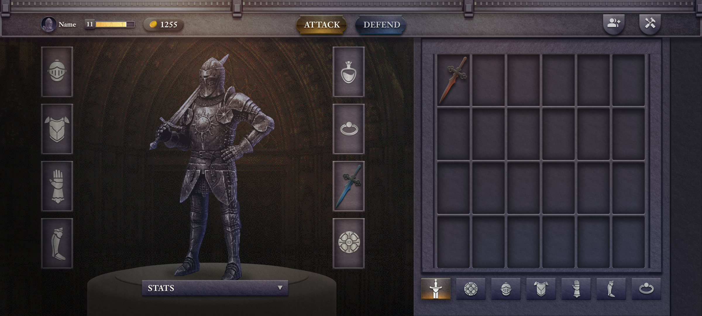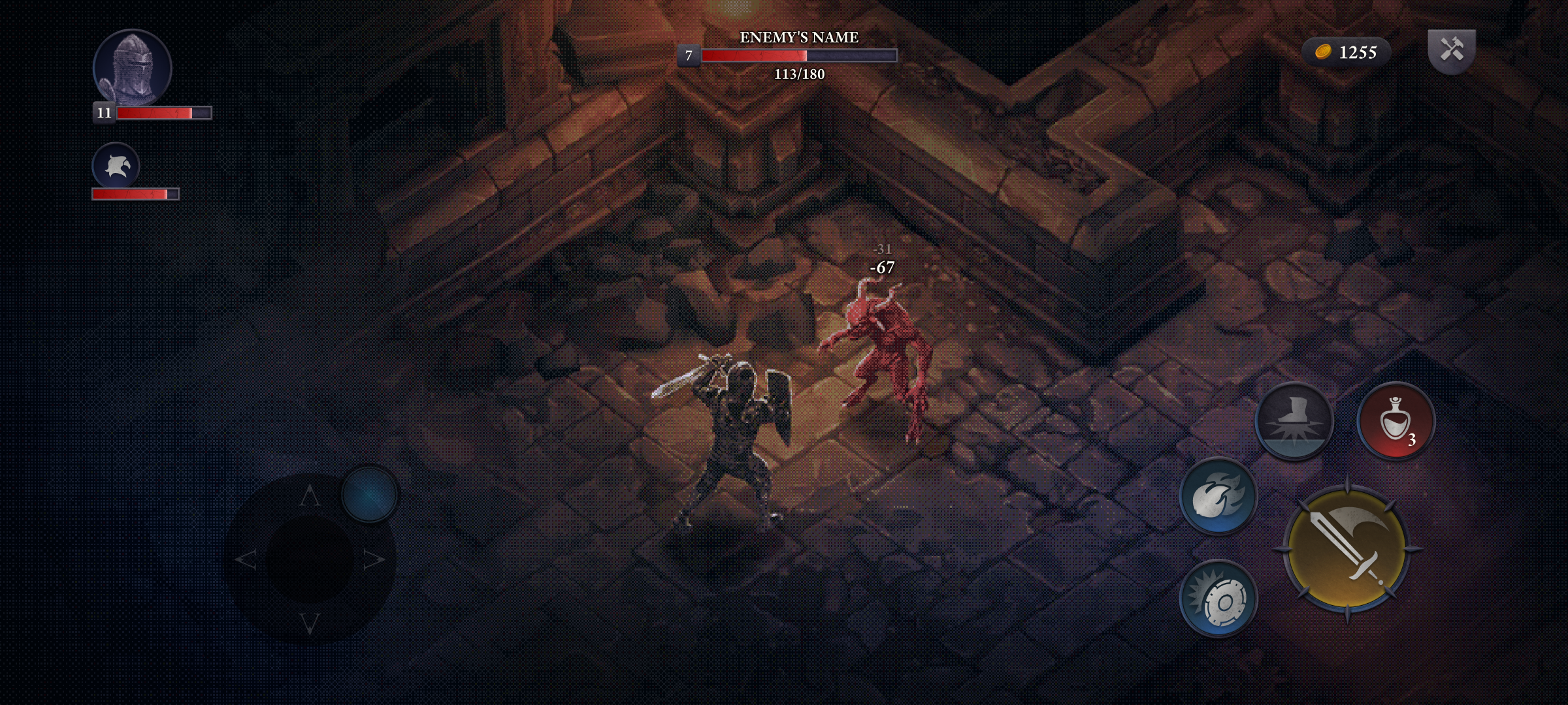 The active combat phase where players first navigate a map to select their next target and then attack! The UI incorporates mobile-optimized movement and skill triggers, complemented by essential HUD elements such as health bars, currency counter, and settings.