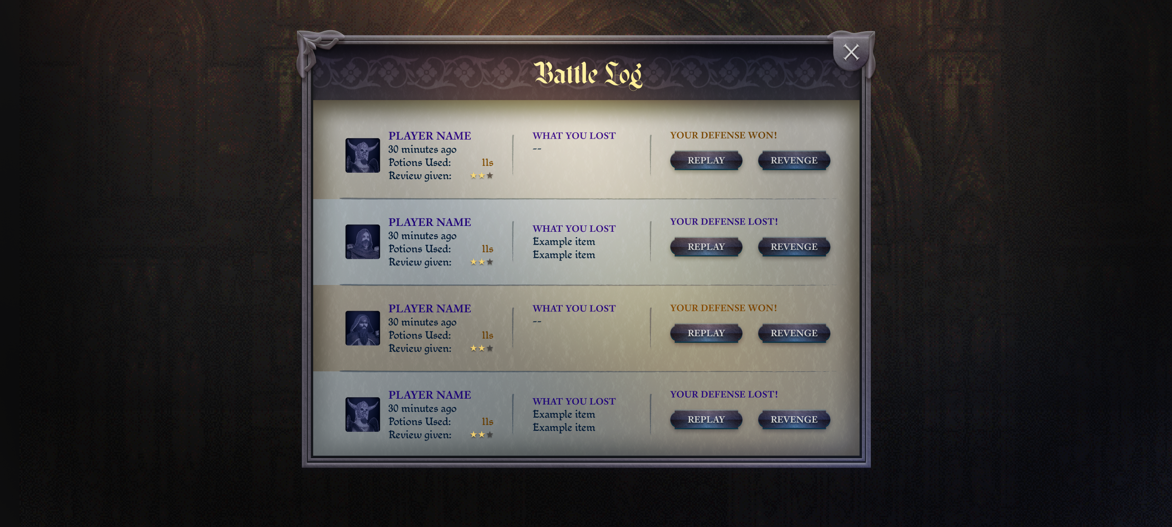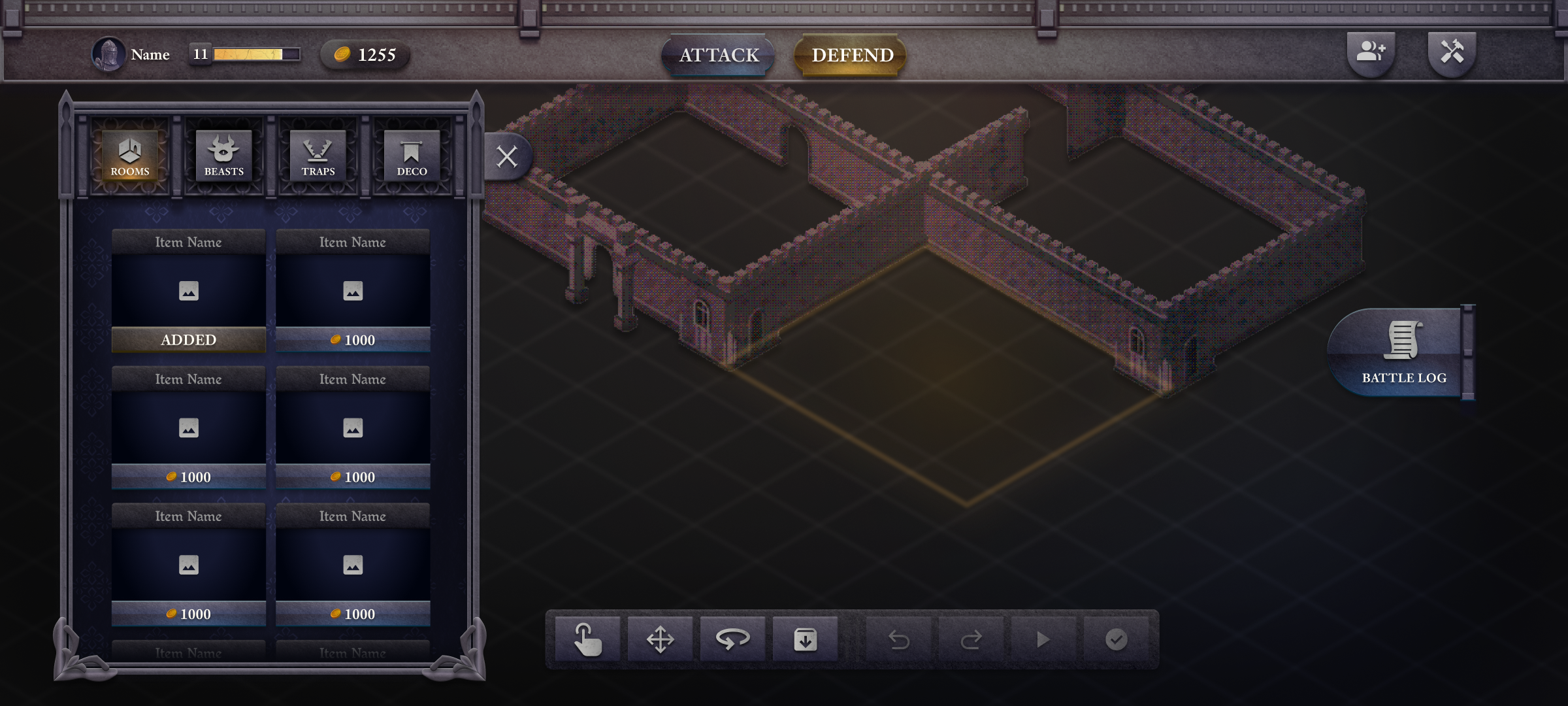 A comprehensive dungeon-building suite featuring mobile-optimized controls for placing rooms, traps, enemies, and decorations. This section includes a battle log for monitoring defense performance and reviewing win/loss history.