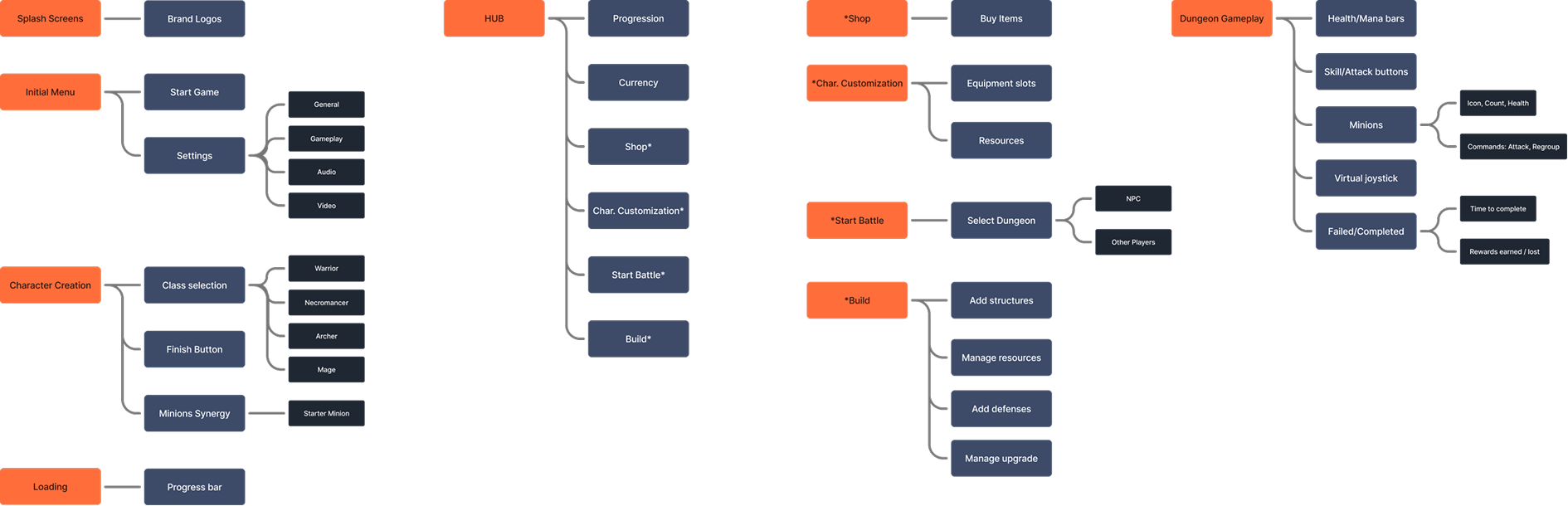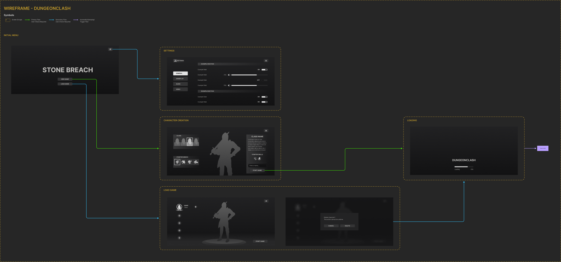 The following wireframes outline the primary game flows and core user journeys, detailing the navigation and interaction logic across the experience.